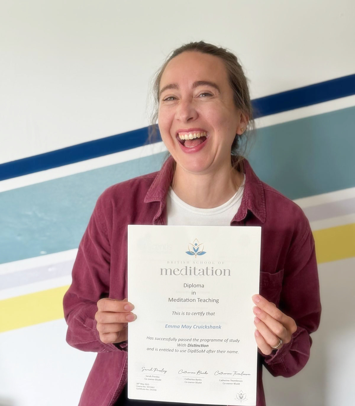 “After a thorough research project into how I could become a meditation teacher (finding some very basic and unconvincing options along the way), I chose to train with the BSoM because they stood out significantly above every other course or organisation I found. The fact that the BSoM qualification is externally accredited (the only provider in Europe who can say this), has 5 full days of taught content split over the course, and requires coursework and other assessed elements over all units, were the key aspects that initially attracted me. I wanted to be properly trained; I wanted to teach with knowledge and confidence, and most importantly, with integrity.
